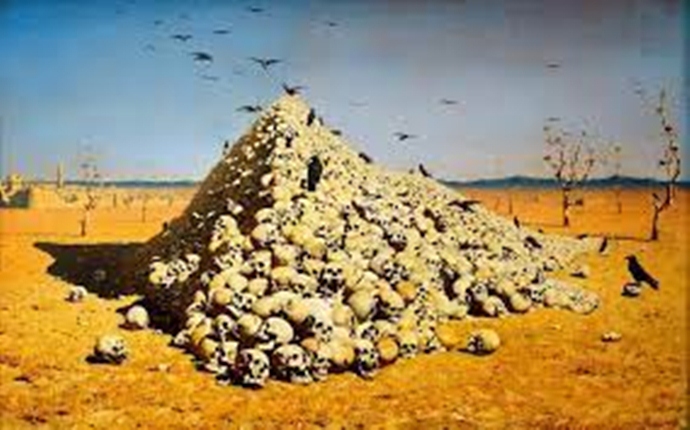 Картина великого русского художника Василия Васильевича Верещагина «Апофеоз войны» написана в 1871 году. На ее раме находится надпись: «Посвящается всем великим завоевателям ; прошедшим, настоящим и будущим».