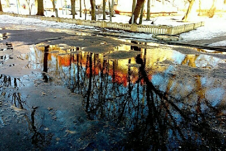 Снега нет, на тротуаре лужа,