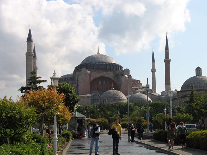 В Древнем Константинополе (Стамбуле) пройдите по гигантскому храму Святой Софии, изувеченному турками, обстроенному минаретами и превращенному в мечеть Айя-София с заштукатуренными фресками и испорченными античными мозаиками.