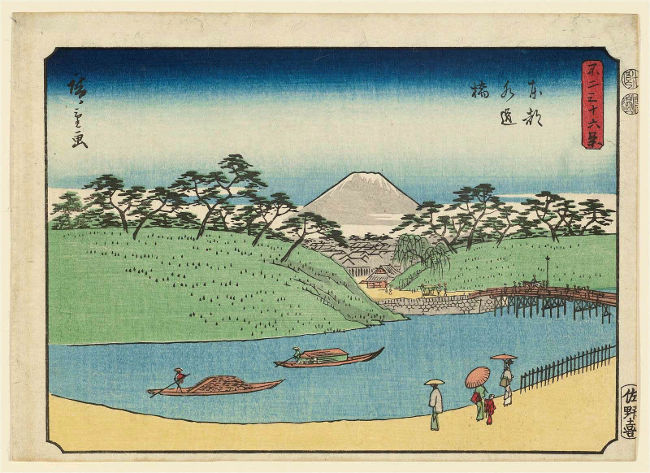 (Иллюстрация: Андо Хиросигэ (1797 -1858) «36 видов Фудзи» 1852 год. «Мост Суйдо-баси в Эдо»)