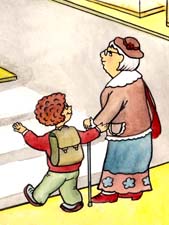 Трудно бабушке идти.