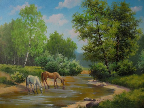 Мирно пасутся кони на берегу реки