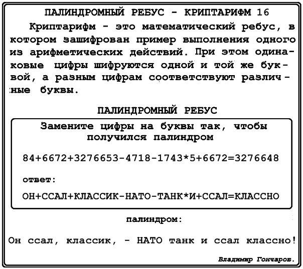 палиндромный ребус – криптарифм 16.