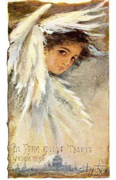 На фото картина русской художницы Елизаветы Бём (Elisabeth Boehm, , в девичестве Индигир; 12 (24) февраля 1843 — 25 июля (7) августа 1914) — русская художница, иллюстратор, силуэтист.) /В тени крыльев твоих укрой меня/