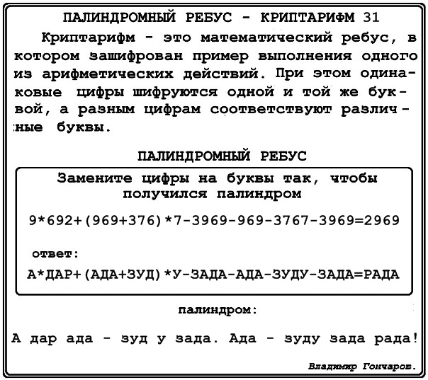палиндромный ребус – криптарифм 31.