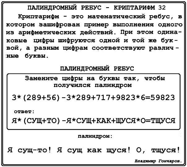 палиндромный ребус – криптарифм 32.