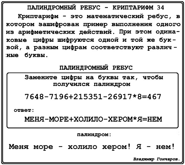 палиндромный ребус – криптарифм 34.