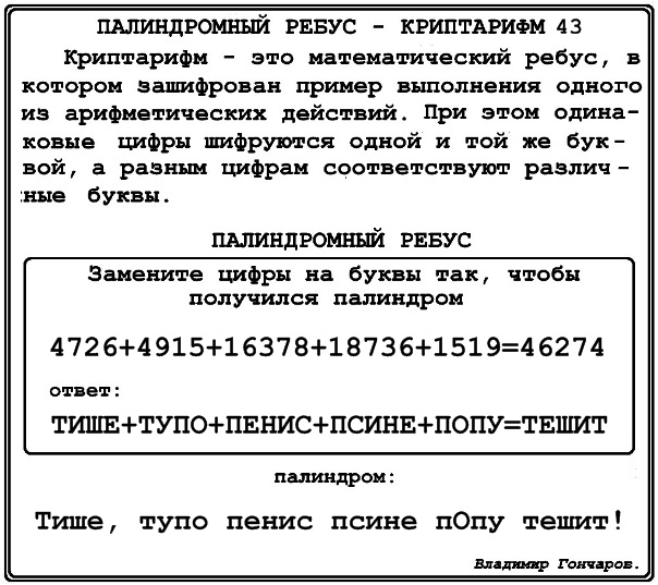 палиндромный ребус – криптарифм 42.