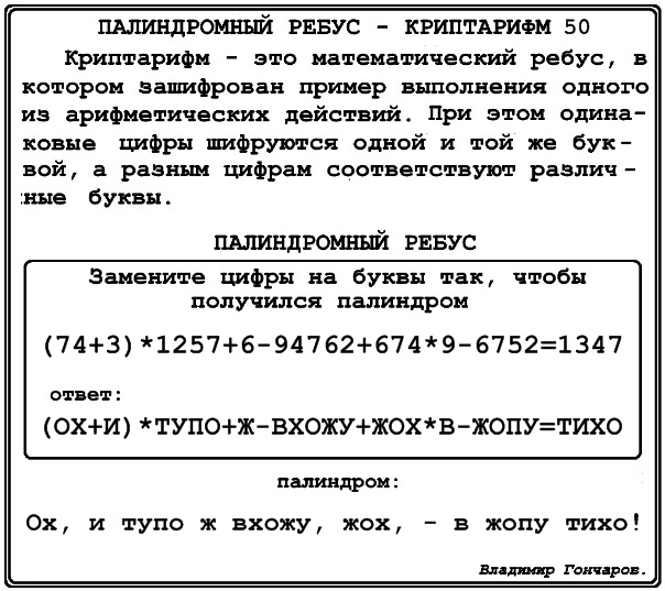 палиндромный ребус – криптарифм 50.