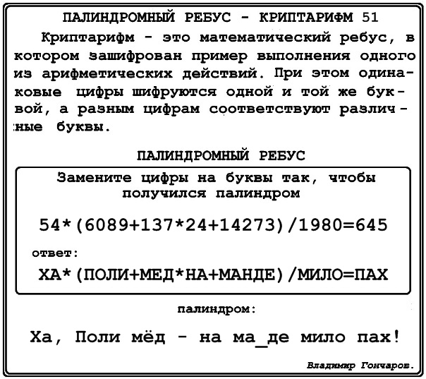 палиндромный ребус – криптарифм 51.