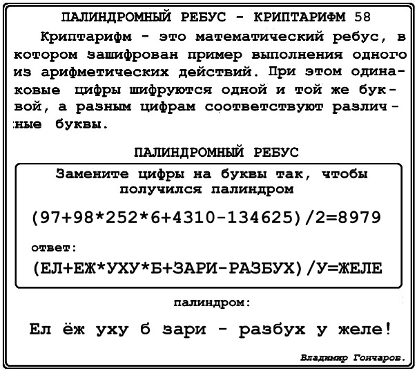 палиндромный ребус – криптарифм 58.