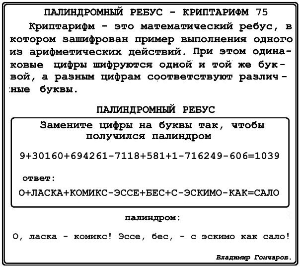 палиндромный ребус – криптарифм 75.