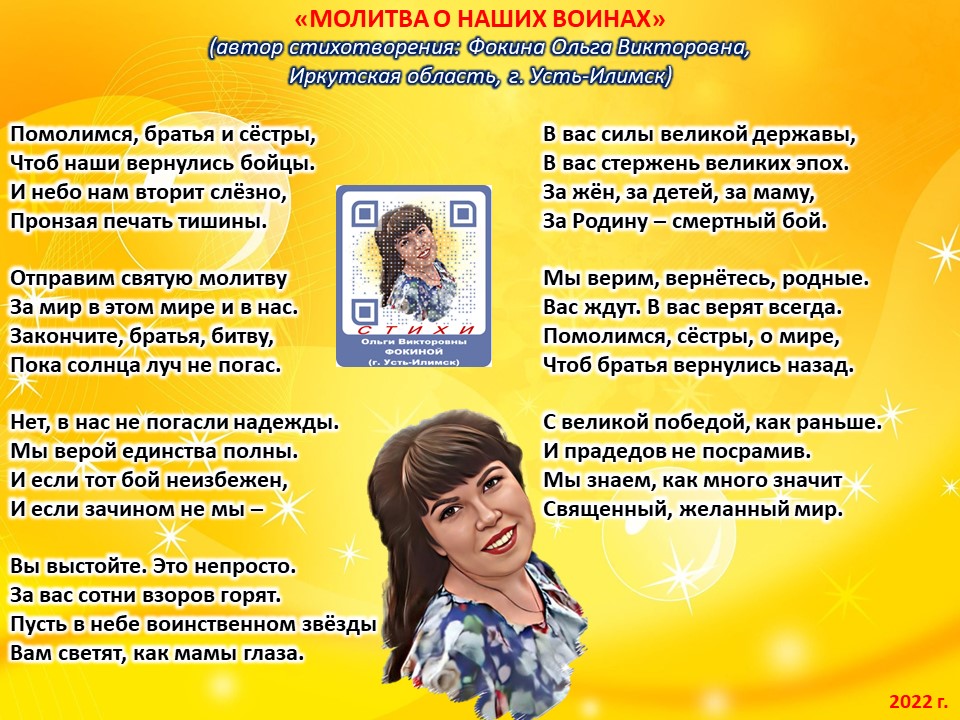 Стихотворение зарегистрировано на авторские права, поэтому его цитирование возможно только с указанием полного авторства: Фокина Ольга Викторовна (г. Усть-Илимск)