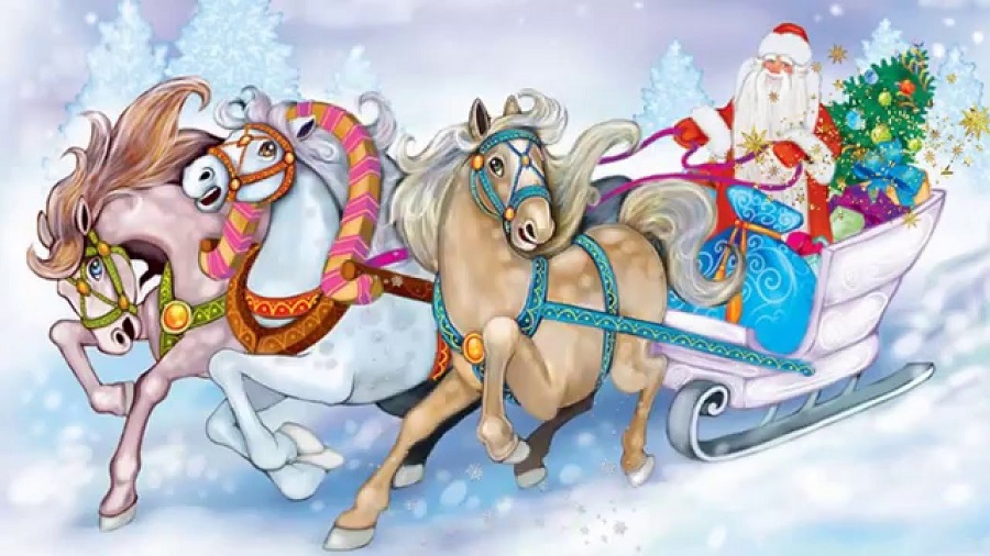 -Эй, Честной народ к нам зима идёт! На тройке с бубенцами едет в гости, между нами, говоря. - Гаркнув три богатыря в латах и броне , каждый воин на коне.