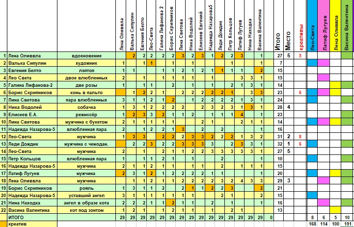 ПЯТОЕ место сегодня у двух авторов ЛЕНЫ ОЛИВВЛА (№1) и ЛЕО-СВЕТЫ(№14), собрано по 27 баллов. Их призы – по 100 баллов.