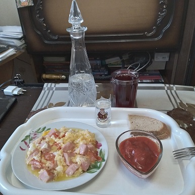 Яичницей, очищенным томатом, соком.