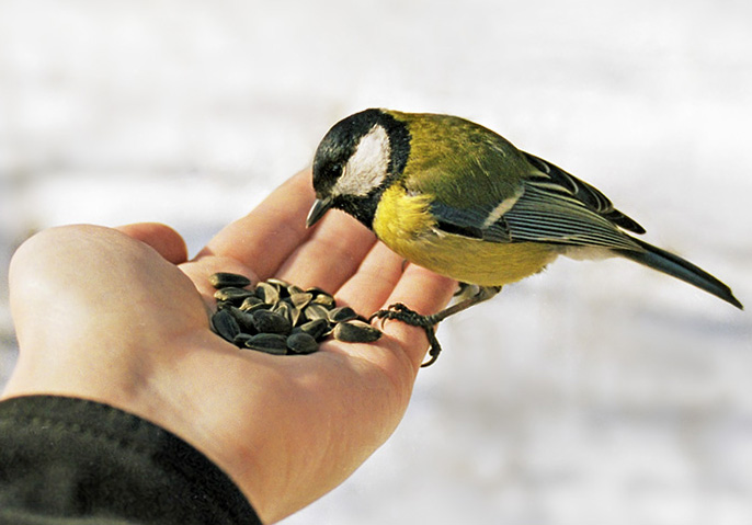 В кормушке семечки и сало.