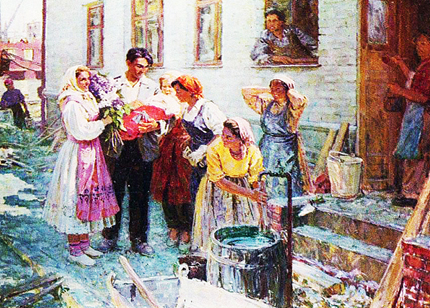 У порога дома.