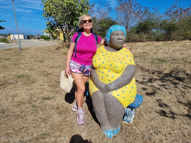 Это совсем не выматывающая жара: март и апрель - самые сухие месяцы на Кюрасао. Я узнаю все инсталляции, которые мы проходили позавчера вечером, и даже опять вижу темнокожую женщину в ярко-жёлтом платье, которую приняла за скульптуру. Как она может опять сидеть возле дороги? Автобусы тут не ходят, встречать и провожать некого! Подходим ближе - всё же это "памятник"! Кто его посадит? - вспоминается строчка из фильма. Может это монумент, посвящённый сериалу "Богатые тоже плачут", где была Женуария - толстая негритянка-служанка. Смотрите видео https://youtu.be/QpXlUfmEROA