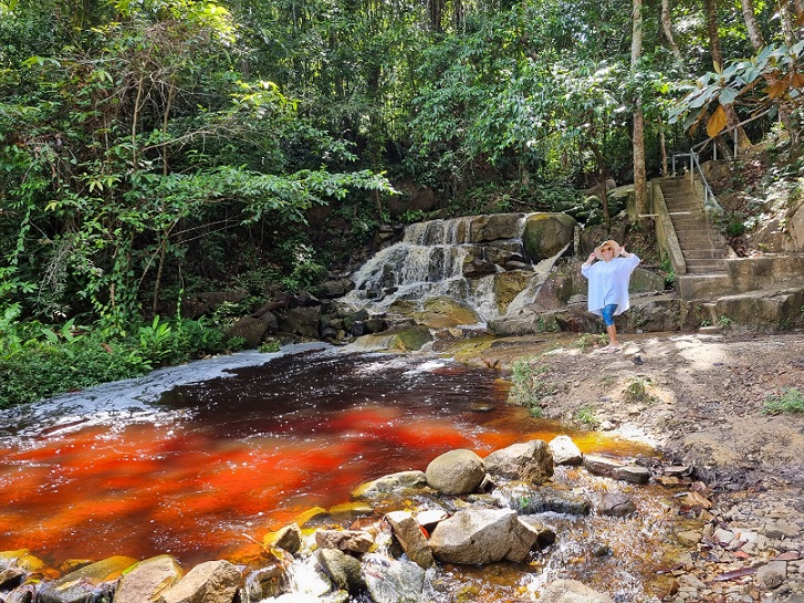 Вода в реке красная, я такую видела на Азорах, муж меня тогда еще заставил ее пить, типа, она полезная, с большим содержанием железа. А эту воду никто не пьёт, но сфотографировать надо. Еще немного вверх и уже виден первый порог водопада. Когда мы были в Индонезии, таких порогов было много, в нескольких можно было купаться, поэтому я приготовилась и надела дома купальник. В Буркина-Фасо на водопадах Банфора, я купалась голышом, мы там были одни. Смотрите видео https://youtu.be/lPnIgET-pbY