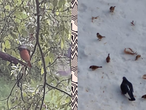 На фото моя птичка, что прилетала ко мне и голубь Оли.