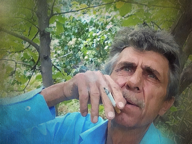 Он в такой же цветастой рубахе,