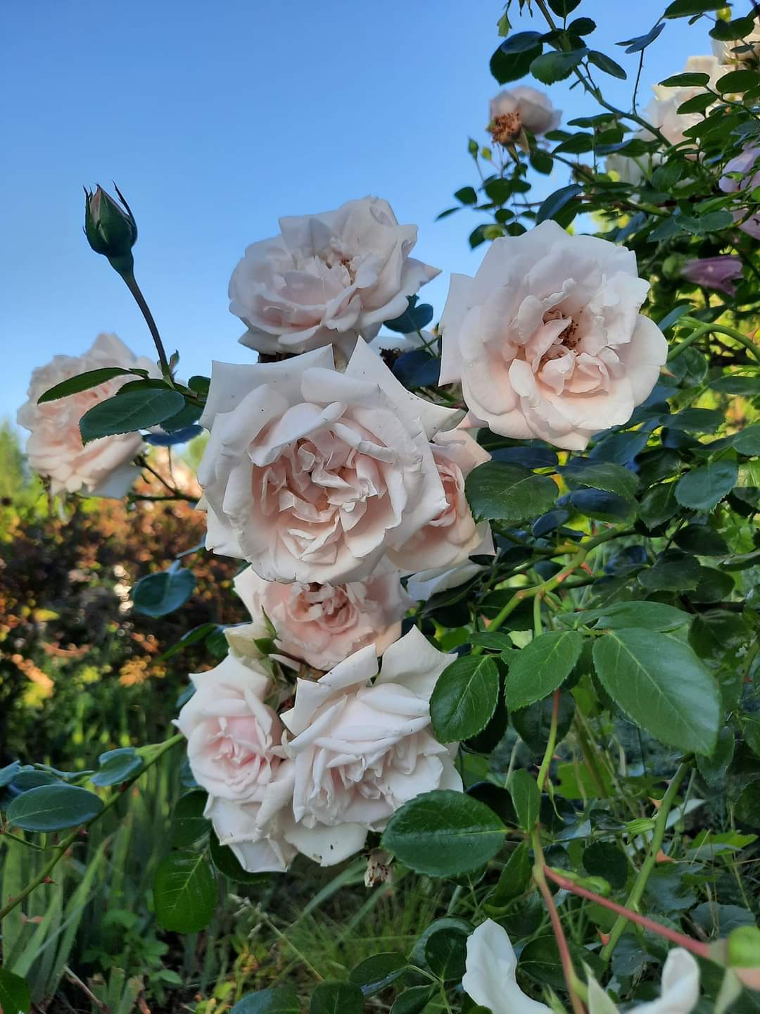 На цветущих кустах.