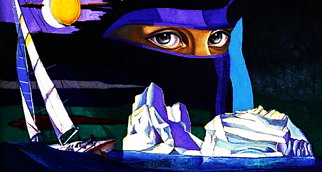 Парусник Иисуса-Ахилла тонет в море. Во льду айсберга голова Вечного Сына Люцифера. Киборг в маске наблюдает. Солнце Вестника под серпом Смерти: