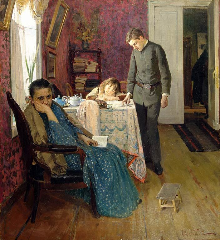Печальна мать… Сын смотрит виновато –