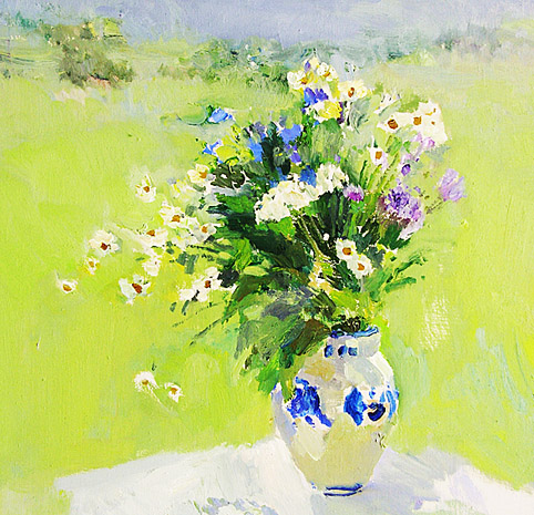 За стволы берёзок.