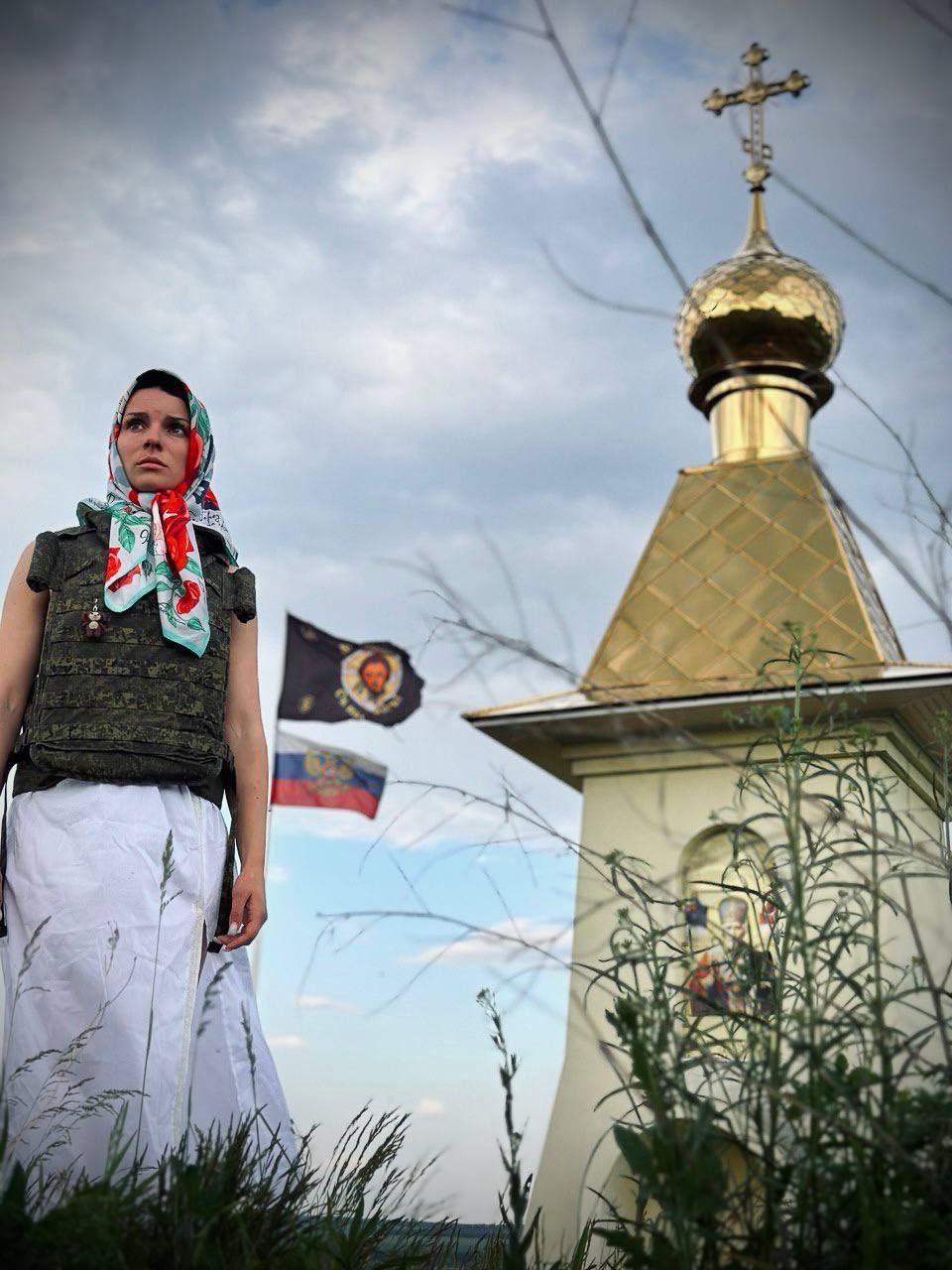 На фото девушка Ульяна Стриж, военный волонтер Штаба Захара Прилепина в шёлковом платке "Город До". Фото Ульяны.