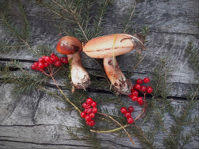 Никогда ещё таких тяжёлых увесистых грибов я из леса не носила. Они забавно глухо звучат при постукивании друг об друга, словно не съедобные грибы, а ёлочные игрушки. По дороге ещё пару веточек калины с ягодами предложил лес.