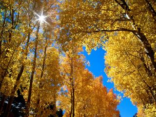 Сквозь листву золотую синеет заплаткой