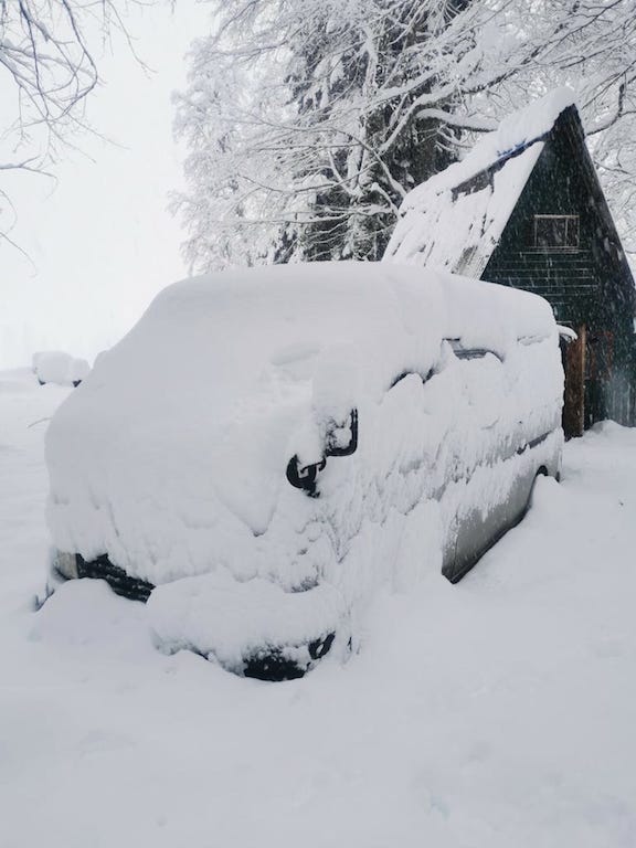 Но... кто-то из нас - везунчик, это точно! На снегоходе подъехал местный парнишка-абхаз. Попросили, чтоб в нашу группу в ватцапе скинул просьбу о помощи. Ближе к полуночи мы услышали рёв машины и огни фар. Наши спасители! Это Тим ( у него в аватарке фраза " живу в горах больше, чем в городе") и школьный друг Вилис ( работает в лавинной службе). Ребята крепкие, здоровые! Приехали на зверь-машине Nissan Patrol, движок 5,8 л. Дорогу к нам пробивали "методом качели"- на скорости вперёд -назад, вперёд -назад. На буксире потащили нас вниз. По дороге увидели увязшую "BМW" с пермскими номерами. Два равнинных мажора-дрыща( фотограф и риэлтор) вывезли девчонок попонтоваться в абхазские горы!))). Если б не наши ребята, куковать бы им там до весны! А по весне только железо бы и осталось. Волки и медведи здесь водятся лихо! BMW также прицепили тросом. И таким "эвакуационным поездом" мы спустились на дорогу к озеру Рица."