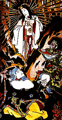 Аматэрасў о;миками, «великая священная богиня, сияющая на небе», либо «владычествующая на небе»[2][4]) — богиня-солнце в японской мифологии, одно из главенствующих божеств всеяпонского пантеона синто, согласно синтоистским верованиям, прародительница японского императорского рода. Считается, что первый император Дзимму был её прапраправнуком. Правительница Небесных полей Такамагахара (яп. ;;;). Согласно легенде, в прошлом император Сёму испытывал трудности с завершением Великого Восточного Храма Тодайдзи и грандиозной статуи будды Вайрочана в нём. Когда он обратился за помощью к Аматэрасу через жившего в VII—VIII веках чудотворца Гёки, богиня ответила, что она и есть будда Вайрочана. Тем не менее, скорее всего данная легенда появилась значительно позже описываемых в ней событий, так как первые её упоминания относятся ко второй половине XIII века[5].