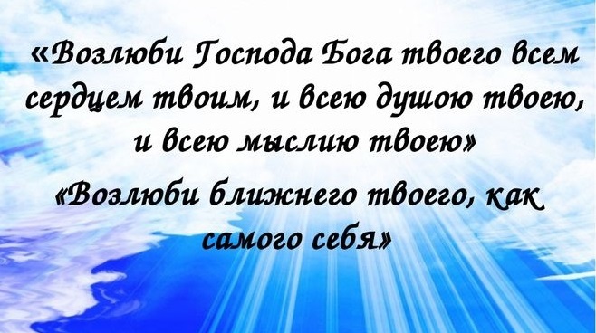 «Возлюби Господа Бога твоего всем сердцем твоим и всею душою твоею и всем разумением твоим– Сия есть первая и наибольшая заповедь; Вторая же подобная ей: возлюби ближнего твоего, как самого себя.» (Матф. 22:37–39)