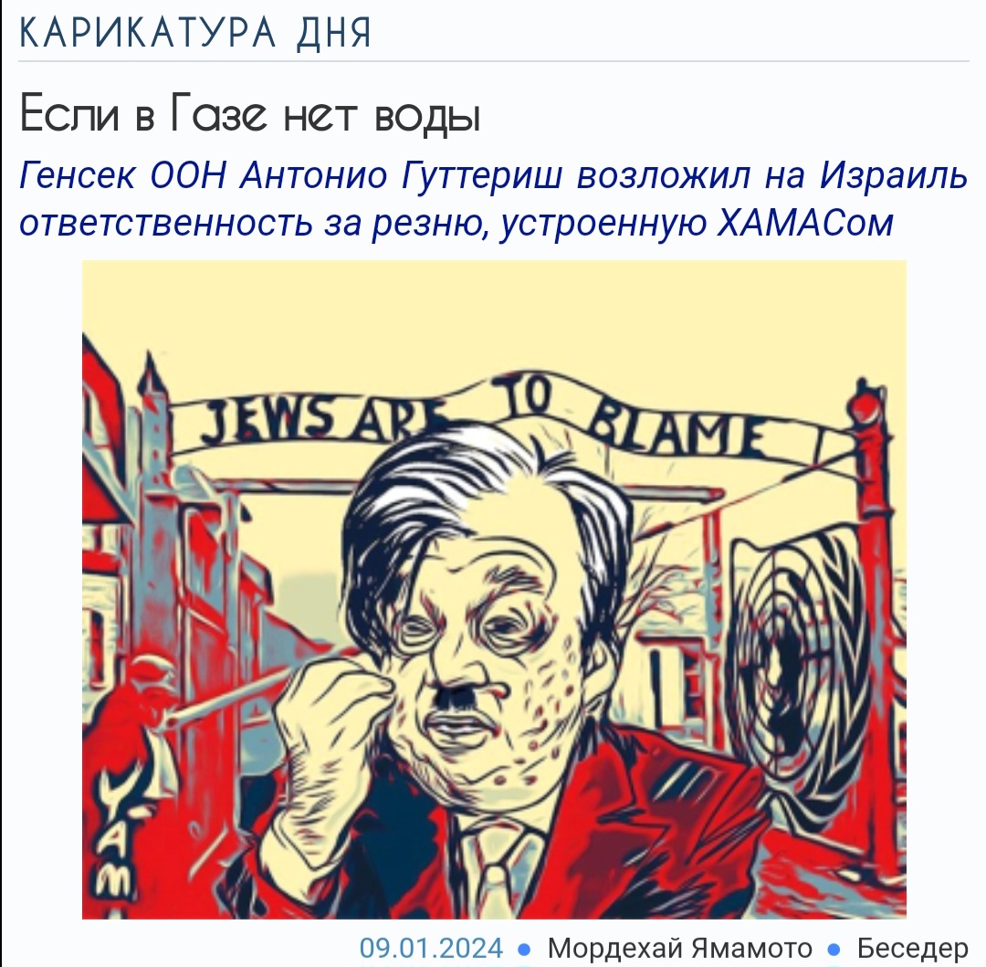 Здравствуй, Андрей! Израильтяне меня удивляют своими шуточками дебильными. Изображать Гутерриша в виде Гитлера, потому что он осуждает убийство цахал тысяч детей, сейчас не очень умно. Многие подумают, что у Адольфа были основания...