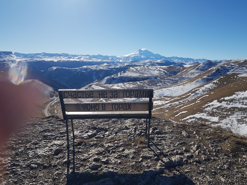 Горы начались очень быстро, минут через 20 дороги, если в городе +8 и не увидеть снега, то в горах минус и кругом белым-бело. Уши закладывает, дети у нас тут же уснули, их укачало, а мы наслаждались горными пейзажами. На обзорной площадке вышли на улицу, там можно посидеть на скамейке, где написано: "Счастье не за горами, оно в горах", но ветер и холод долго не дали там задержаться, зато вершина Эльбруса была видна великолепно и Лёва, который тут же проснулся сказал: Мама, я нашел Северный полюс!