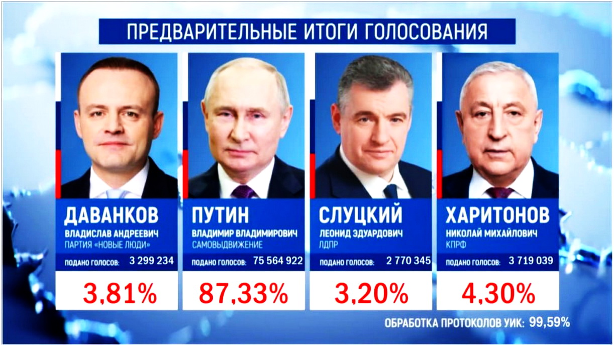 В Центризбиркоме завершилась обработка бюллетеней. Подсчитаны все 100% и появились окончательные данные по голосованию на выборах президента России. Итак, убедительную победу с историческим результатом одержал Владимир Путин. За него свой голос отдали 87,28% избирателей. И это самый высокий показатель в современной России. Отрыв от соперников просто колоссальный!