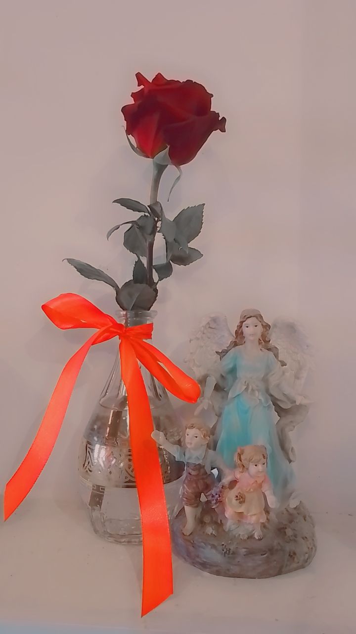 С улыбкой ангел с полочки моргает