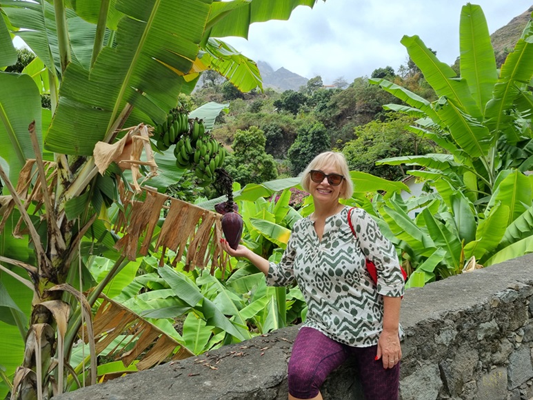 Идти по дороге сначала приятно - мы фотографируем красивые места, удивляемся, что в горах кругом селения и в них в воскресный день работают магазины, кафе и рестораны. Зря мы перестраховались и тащим воду с самого Порто-Ново - всё можно купить здесь. Этот остров мне очень напоминает Сан-Николау, где выращивают всё: так и здесь кругом растут, как трава, бананы (правда, они и есть трава).