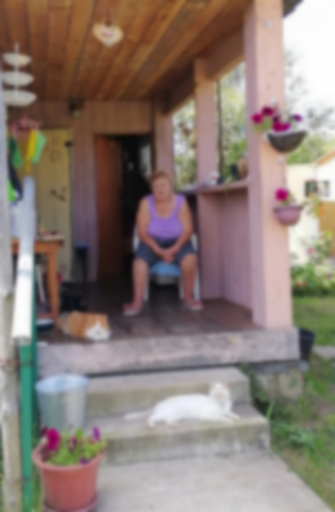 В кресле на крылечке.