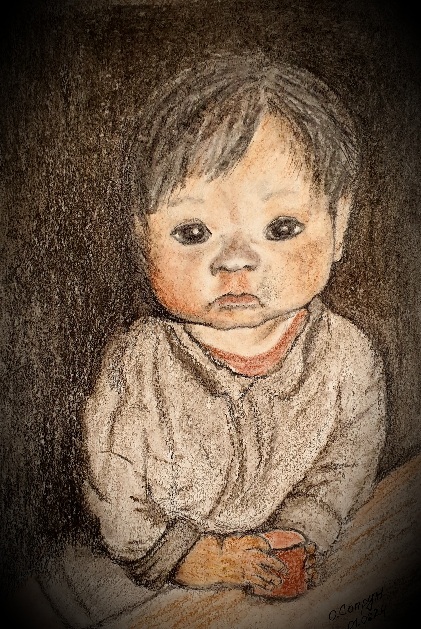Увлеченно повторяла оттенок кожи чумазого ребёнка сангиной, углём и сепией. Складочки на одежде и фон активно дорабатывала карандашом и ватной палочкой.