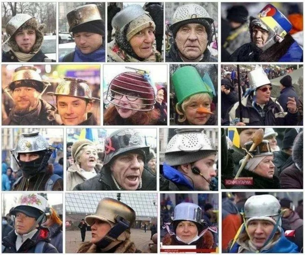 Натянув на головы кастрюли.