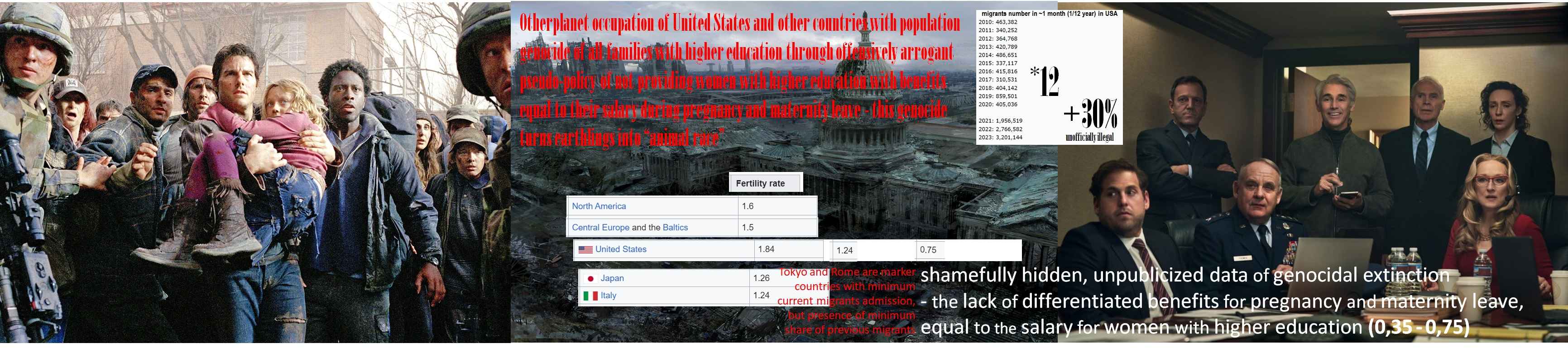 6. From genocide of recent past, LET'S PAY ATTENTION TO CURRENT GENOCIDE FOR MORE THAN 50 YEARS - this is genocide of all countries of our world through CONTINUING GENOCIDE OF INTELLIGENCE, ELITE OF EACH COUNTRY AND ALL COUNTRIES TOGETHER - women invest their lives in education with obtaining HIGHLY SKILLED JOBS - all countries are lowered to animal level in matter of DIFFERENTIATED BENEFITS FOR WOMEN DURING PREGNANCY AND MATERNITY LEAVE - there is no need for “lot of intelligence” or “Nobel Prize winners” - here there is simply benefit EQUAL TO WOMAN’S WAGE AND SAME COMPENSATION TO EMPLOYER FOR TEMPORARY REPLACEMENT SPECIALIST is benefit amount thousand times less than any budgeted amount in federal budget - this is direct sign and evidence of otherplanet occupation and the attitude of this otherplanet occupation agents towards real citizens of Earth as animals, as if terrorists captured Earth citizens as their victims - and this is not even comparison - this is fact what's happening!