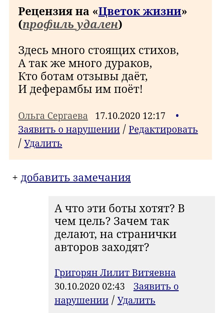 Дааа... понимаю Ваше неприятие всего этого. Если автор не отвечает на рецензии, это не всегда бот: наедешь на него, мол, что за некультурие - сразу появляется. Светланович Федосеев появился тут же с иринами-маринами - группой поддержки, а попросту "гаражными"/"консервами"/"летучими обезьянами"/"гаремными" и пр. -