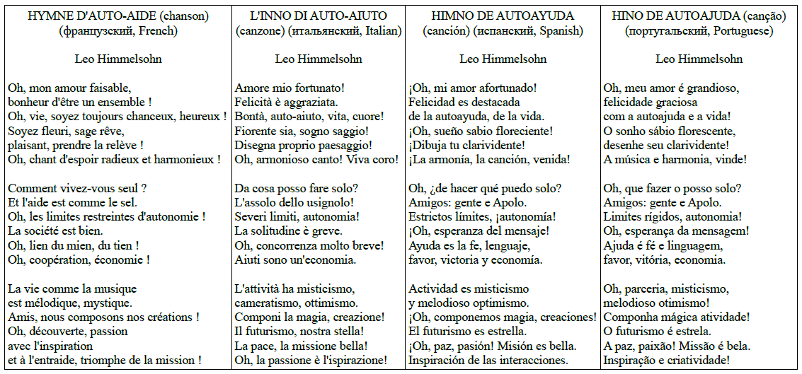 SELF-HELP HYMN (song) (single multilingual poem, author's equivalents in Russian, Ukrainian, English, German, French, Italian, Spanish, Portuguese, Latin, Esperanto)