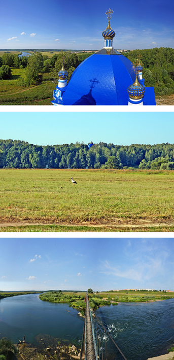 Фото Сергея Коробцова – вид на посёлок от храма в честь Рождества Христова, аист в пойме Угры у Товарково и висячий мост через Угру