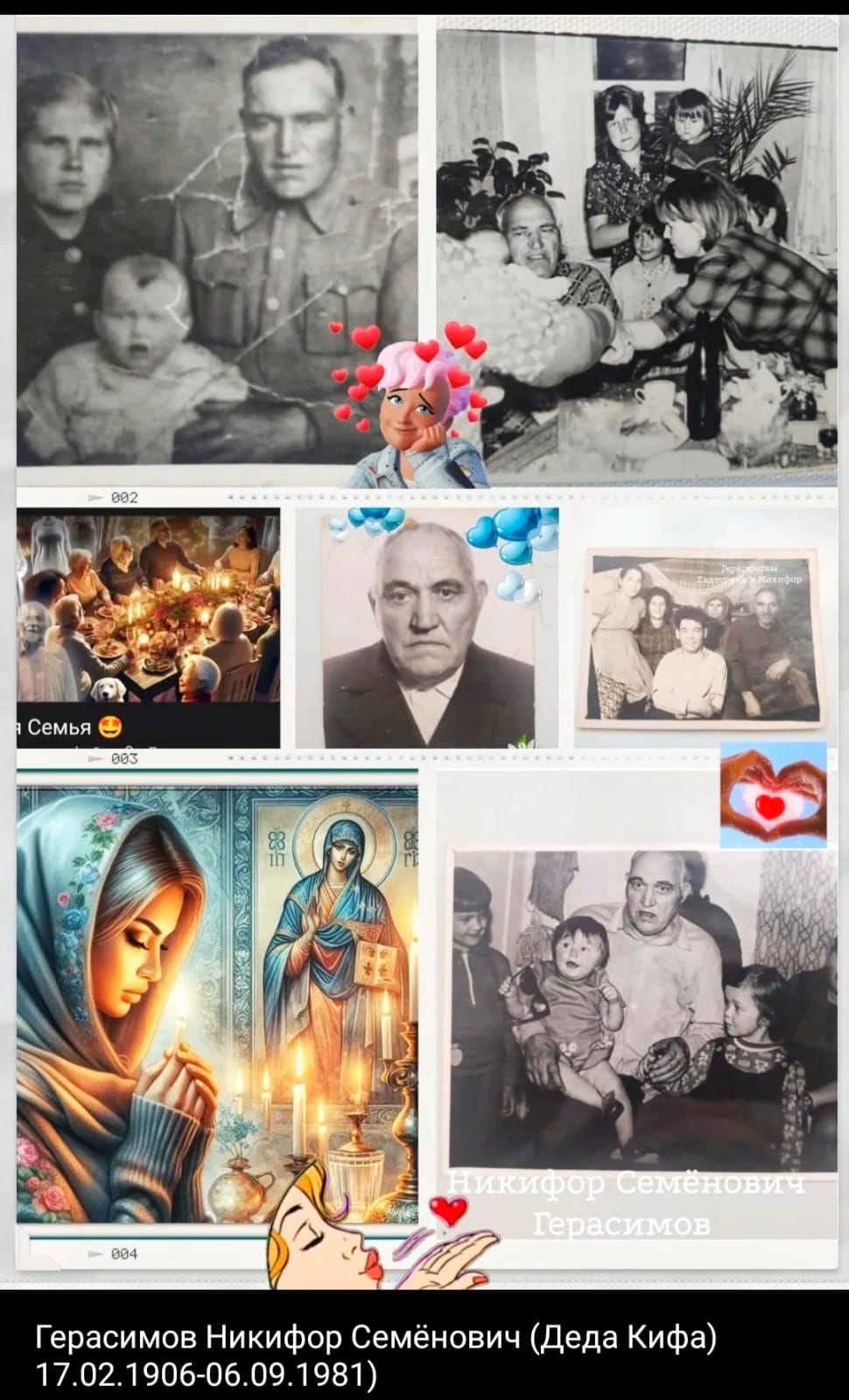 Его крестили 17.02.1906 года Герасимов Никифор Семёнович. Приехали в двенадцатый раз... А всё "нормальные" имена то разобраны, то не то.. а в этот раз нарекли. В семье 11 детей, из них единственная девчонка Аннушка, любимица, хлопотунья и на хозяйстве и вместо матери по дому.