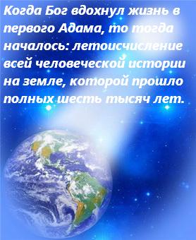 Когда Бог вдохнул жизнь в первого человека, то тогда на земле началось исчисление лет, всей человеческой истории, которой прошло полных шесть тысяч лет. Итак, далее следует: если сегодня от Рождества Христова идёт 2024 год, суть уже тринадцатое тысячелетие, то при полном возрасте планете нашей из 12-ти тысяч лет по Священному Писанию (2-е Петра 3:8) земля у Бога за шесть дней сотворилась, а для нас – людей за шесть тысяч лет Богом сотворилась.